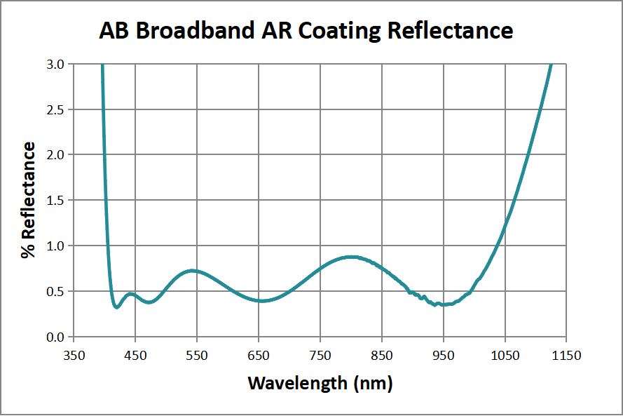 V膜是一种多层的AR介质薄膜,能够最大程度地减少窄波长范围内的反射率。V膜表面反射率在最小值的两侧上升很快,因此反射率曲线呈"V"形。与宽带增透膜相比,当光束处于指定的AOI范围时,V膜在窄带宽范围上的反射率更低。