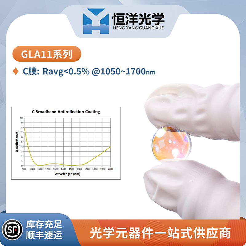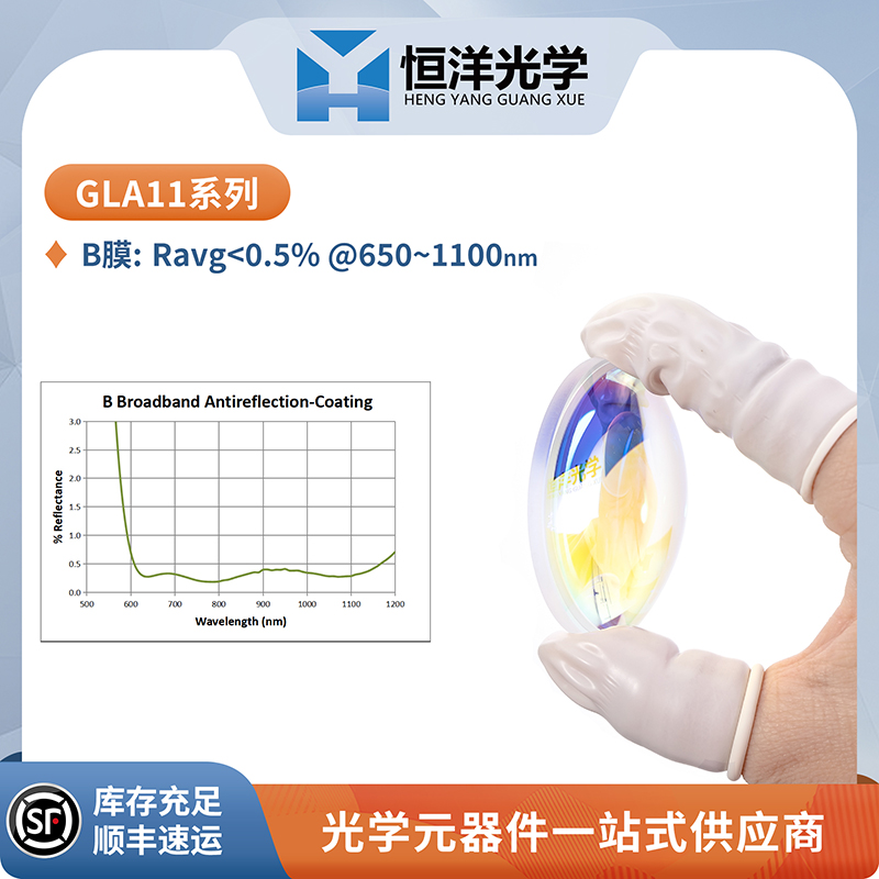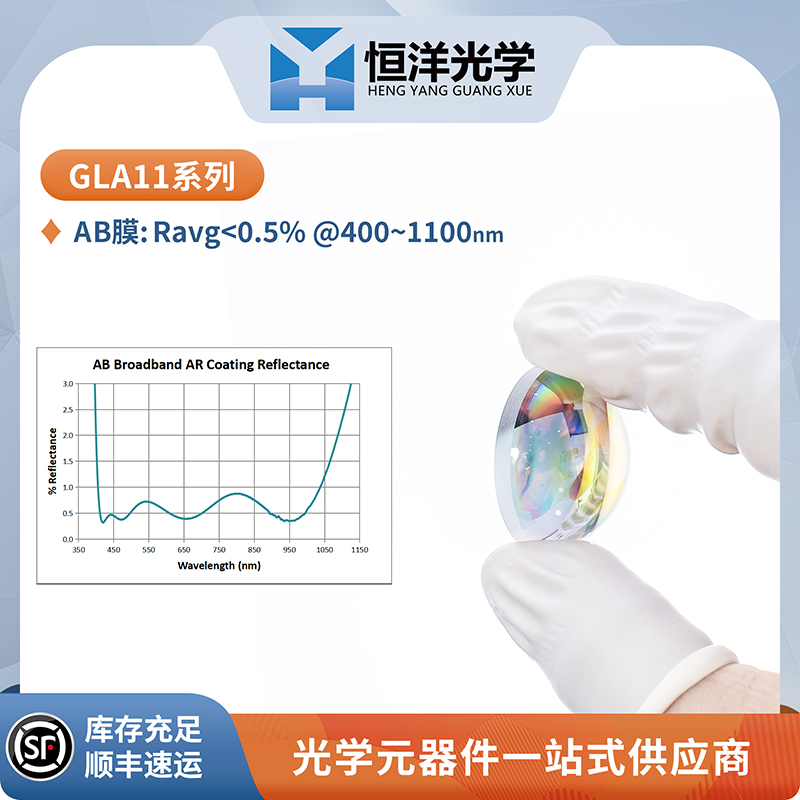 GLA11系列 平凸透镜标准件可选未镀膜和镀四种宽带增透膜的版本:A膜(350~700 nm)、B膜(650~1100 nm)、C膜(1050~1700 nm)或AB膜(400~1100 nm)。