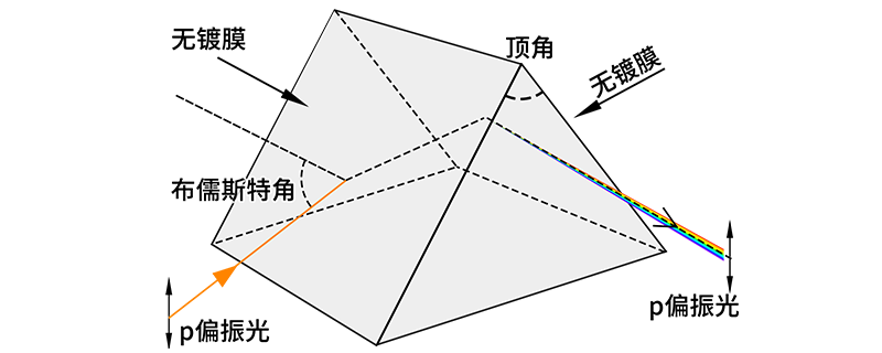 当p偏振光以布儒斯特角入射时,折射光线将平行于棱镜底面进入出射面,从而以布儒斯特角出射,这样p偏振光几乎无损耗的通过了棱镜。布儒斯特棱镜还经常用于从多波长激光中选出我们需要的单色光。