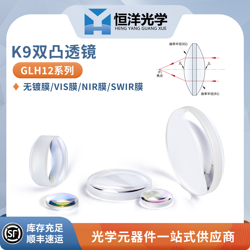 恒洋光学 GLH12系列 H-K9L光学玻璃双凸透镜的特点是焦距为正,由两个相等半径的凸面组成。常用于成像中继系统以及在有限共轭距离下的物体成像。共轭比越大,产生的像差就越大。这种类型的透镜适合在以下情况下使用:物和像在透镜的两侧,且像距和物距的比值(共轭比)在0.2和5之间。