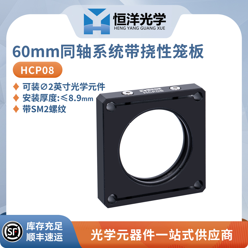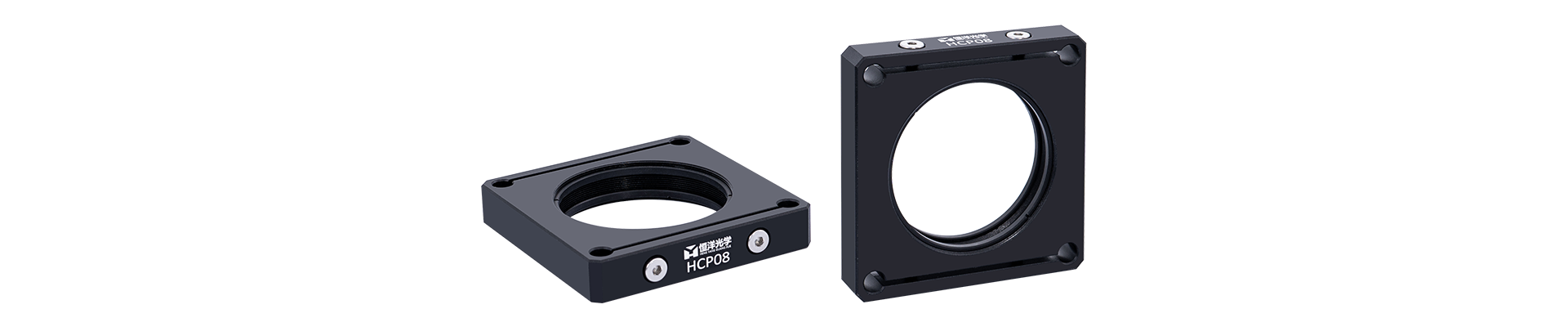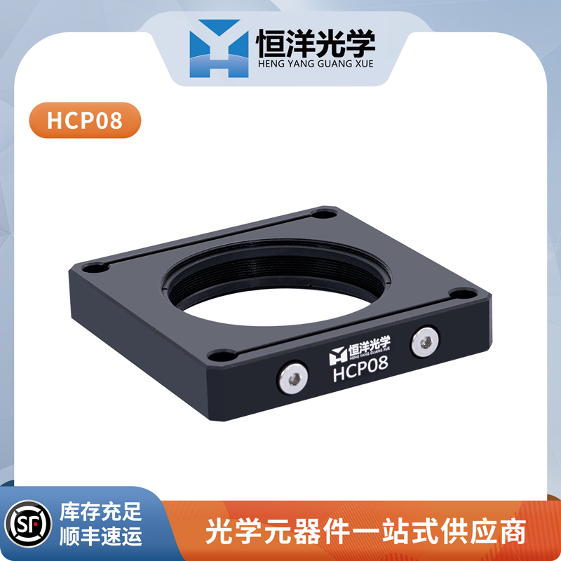 恒洋光学 HCP08 中心位置上的SM2(2.035"-40)螺纹孔和8-32(M4)安装孔,带稳定挠性夹持机制。4个带帽螺丝,每个都有5/64英寸(2.5 mm)六角,用来激活挠性夹具,增加与 HCT系列 笼杆的接触面积。HCP08 中心的螺纹孔可安装厚度≤8.9mm的Ø2英寸光学元件,它还附带一个 SM2RR 卡环(通光孔径为Ø1.90英寸);如要直接安装光学元件,还需购买一个 SM2RR。更厚的光学元件可以安装在SM2透镜套管中,此套管可以拧入笼板。HCP08 顶部有一个小凹槽,表示它是公制产品。