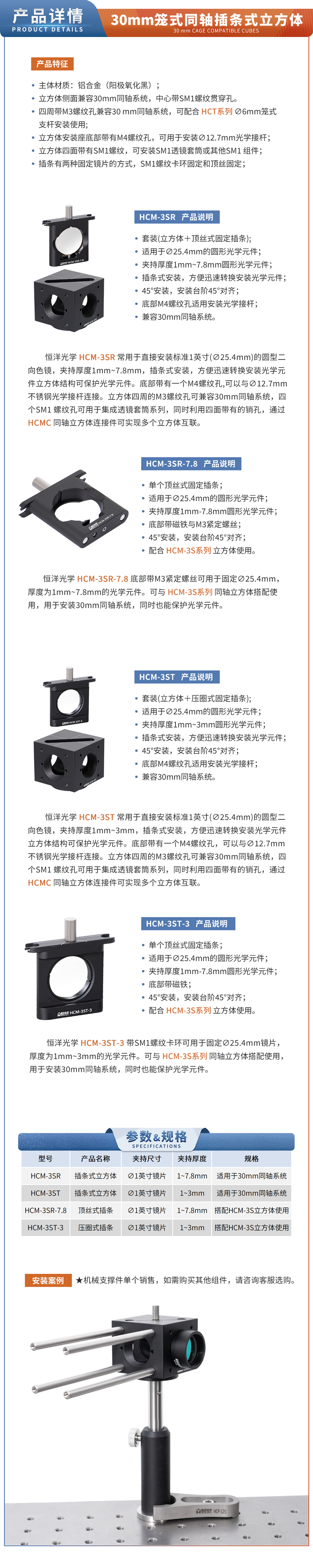 ▶ HCM-3SR 为顶丝式立方体套装,产品包含一个立方体+一个顶丝式插条(HCM-3SR-7.8)。 ▶ HCM-3ST 为压圈式立方体套装,产品包含一个立方体+一个压圈式插条(HCM-3ST-3)。▶ HCM-3SR-7.8 为顶丝式插条,夹持厚度为1mm~7.8mm。 ▶ HCM-3ST-3 为压圈式插条,夹持厚度为1mm~3mm。