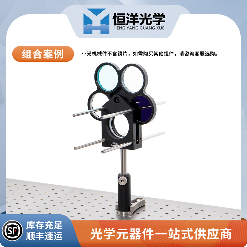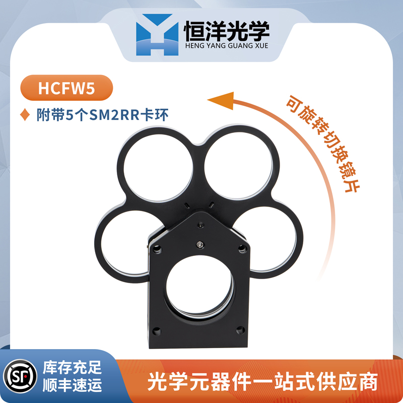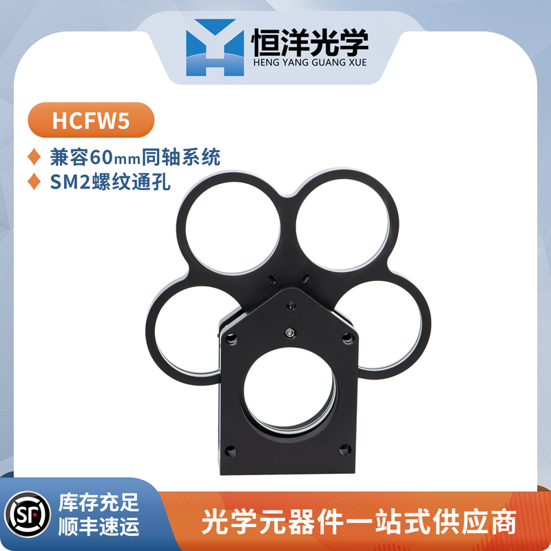 恒洋光学的 HCFW5 滚轮式滤光片安装座是为60mm笼式共轴系统而设计的,具有5个带SM2螺纹的滤光片架,用于∅2英寸的光学元件。弹簧式滤光片轮通过卡口定位,并将滤光片中心对准笼式系统。