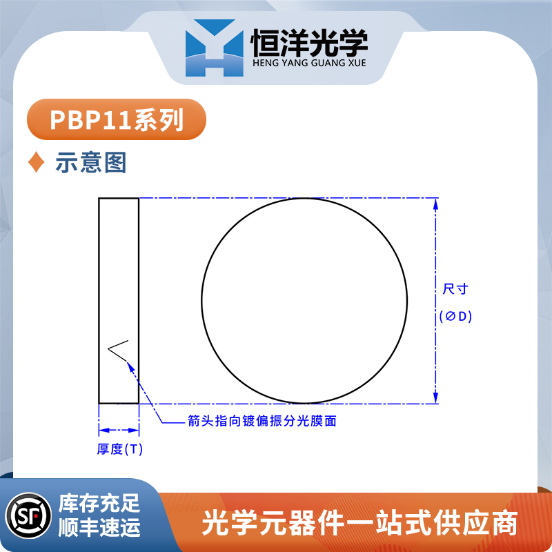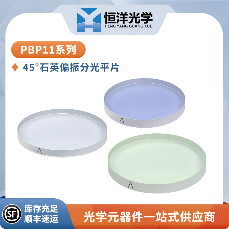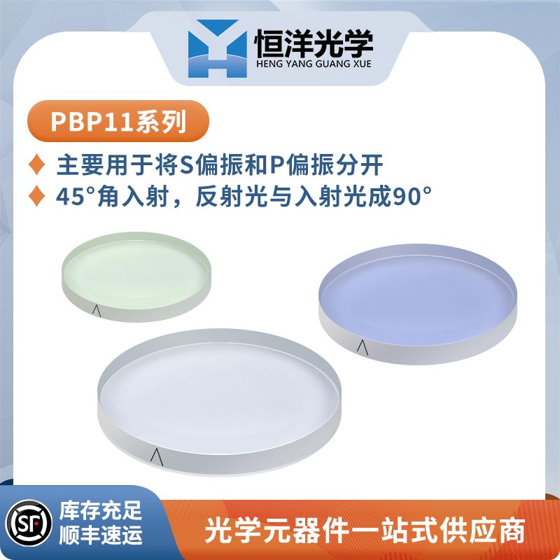 恒洋光学 PBP11系列 45°偏振分光片采用紫外熔融石英基底,是一种可用于分离入射光不同偏振分量(p光与s光)的偏振光学元件,分别对p光透射,s光反射。45°入射时,透射端消光比Tp/Ts>200:1,入射角度的改变会引起消光比的降低。