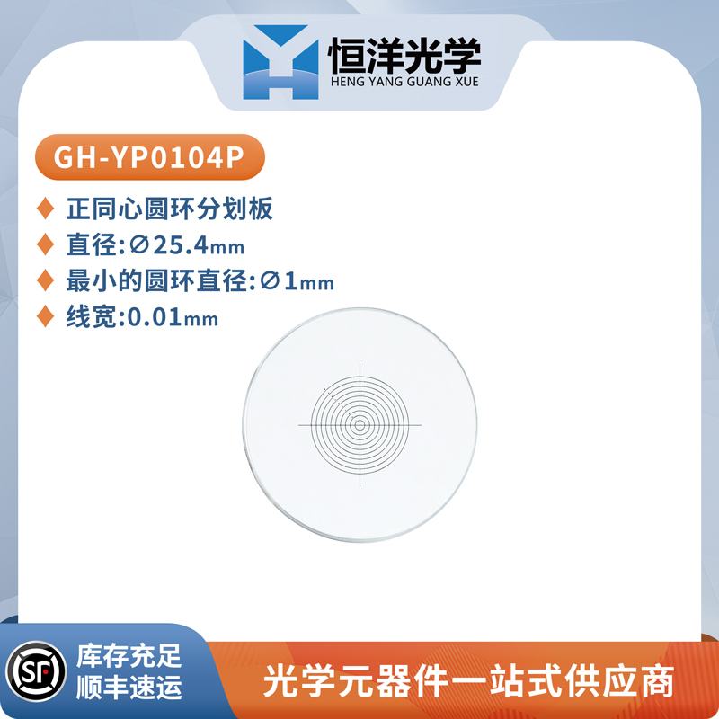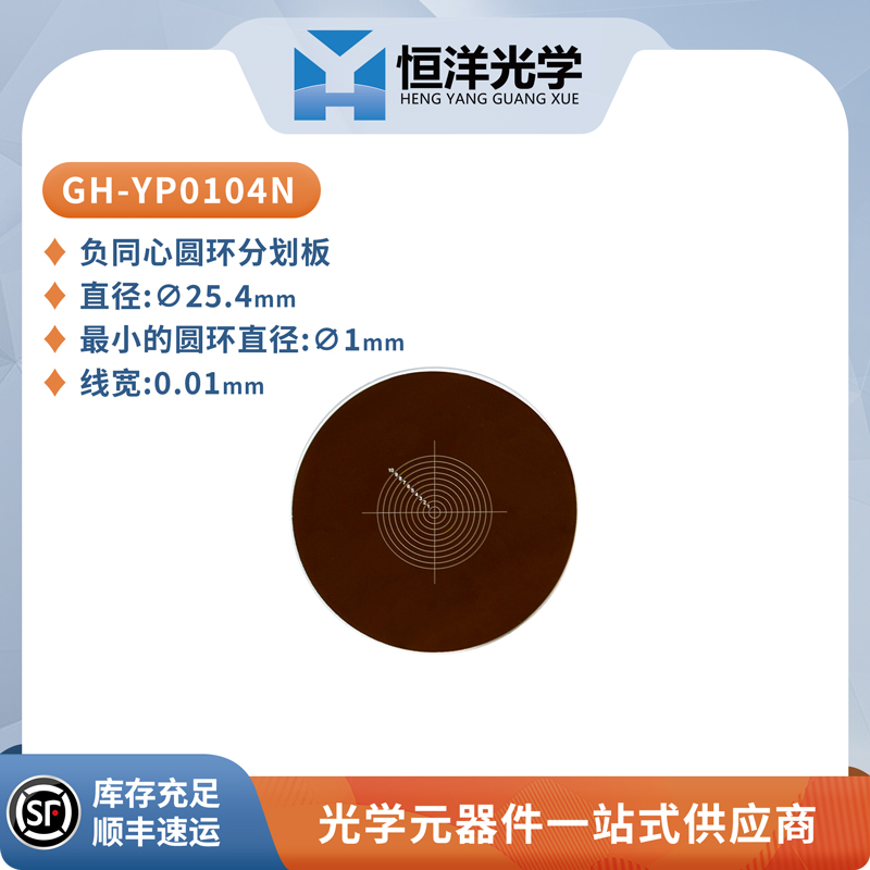 同心环分划板有正片GH-YP0104P和负片GH-YP0104N两种规格。GH-YP0104P 正同心环分划板,正分划板是铬金属图案沉积在透明基底上,应用性较广。GH-YP0104N 为负同心环分划板,负分划板是在透明基底上全部镀铬金属,图案留空,主要在背光或高亮度系统中应用。