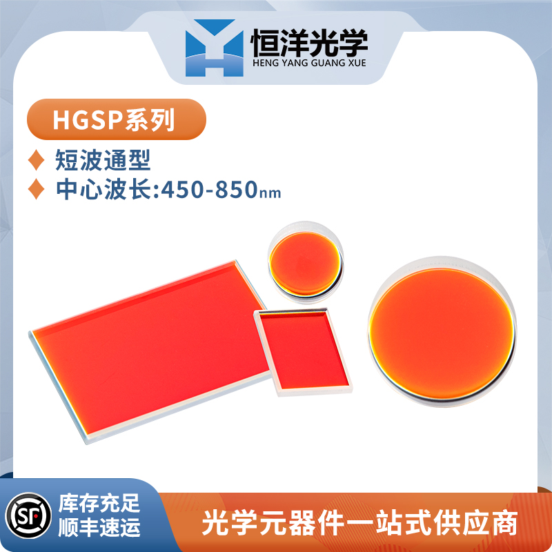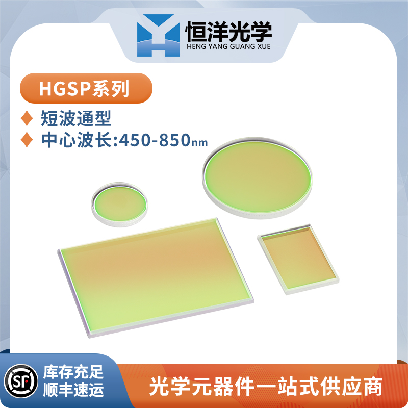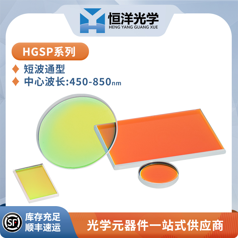 恒洋光学 HGSP系列 普通短波通二向色分光滤光片(或称为二向色分光镜,通常是基于45°入射光束设计),通过在光学玻璃基片表面镀制特殊设计的介质多层膜,从而将入射光束中某部分波段的光以和入射光垂直 90°的方向反射,而其他波段的光则透过。