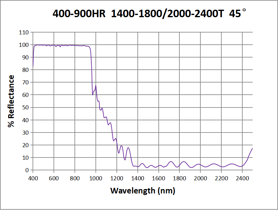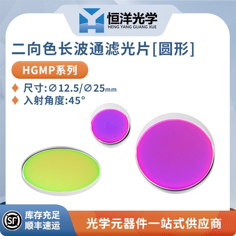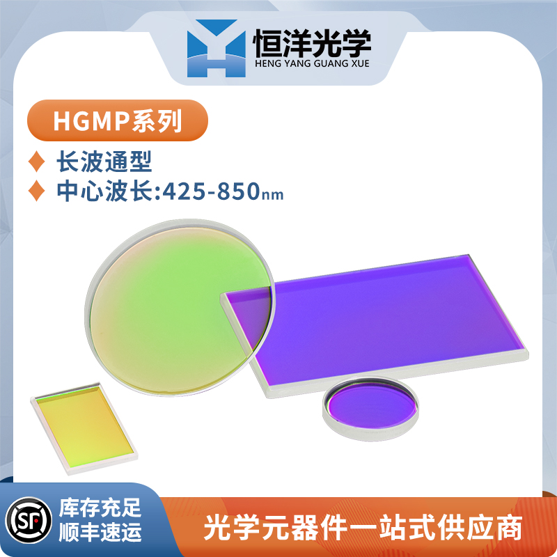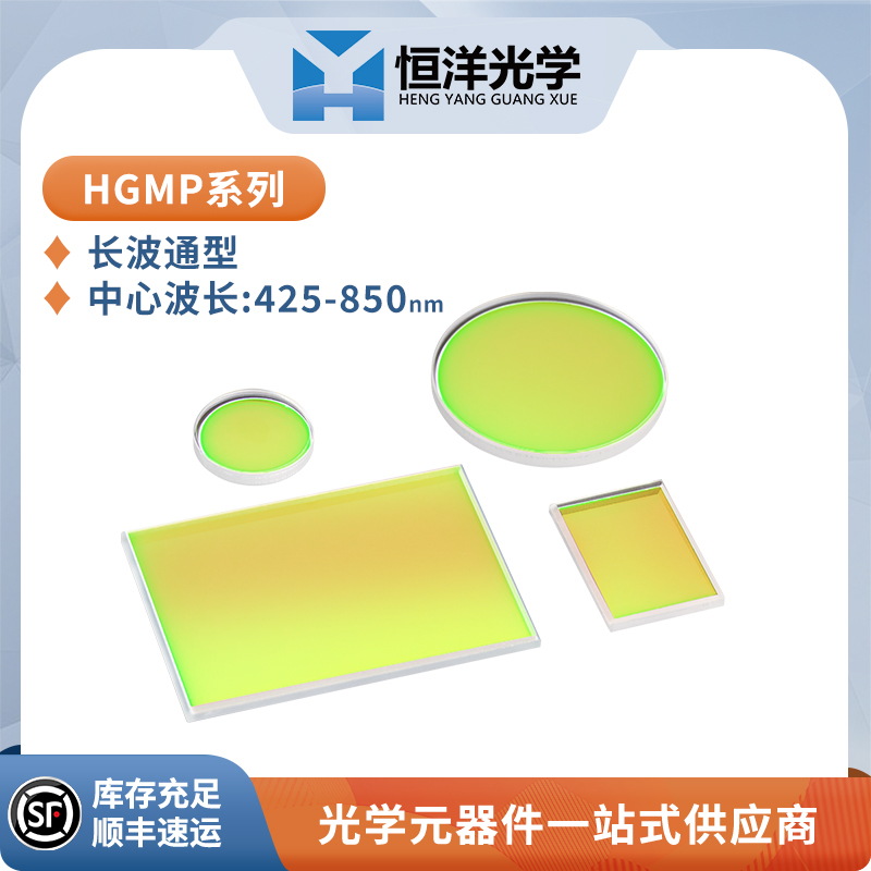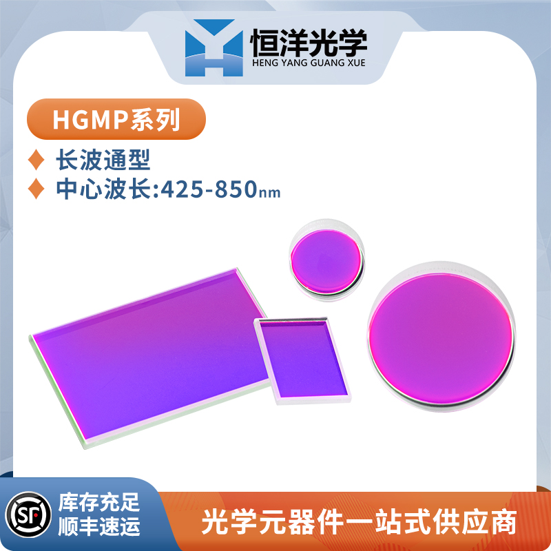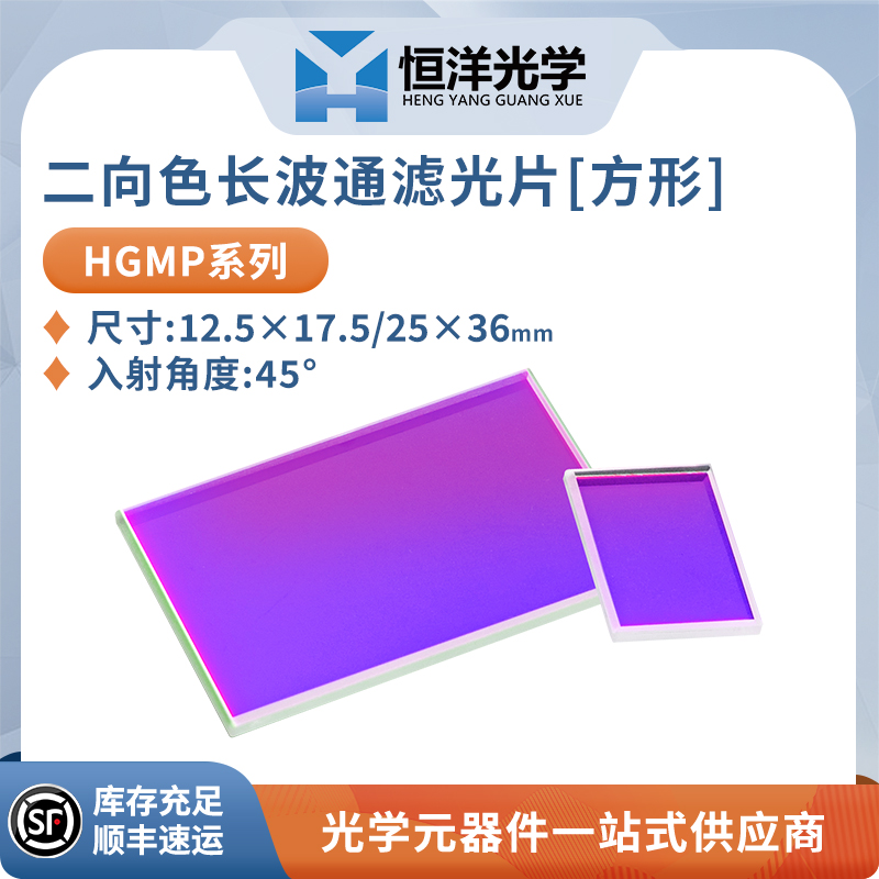 恒洋光学 HGMP系列 普通长波通二向色分光滤光片(或称为二向色分光镜,通常是基于45°入射光束设计),通过在光学玻璃基片表面镀制特殊设计的介质多层膜,从而将入射光束中某部分波段的光以和入射光垂直 90°的方向反射,而其他波段的光则透过。