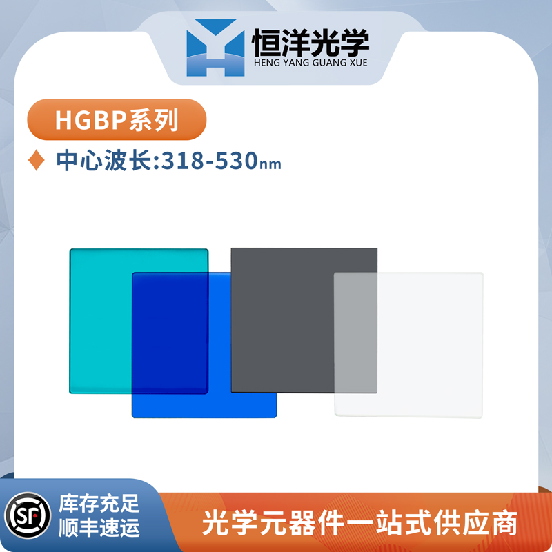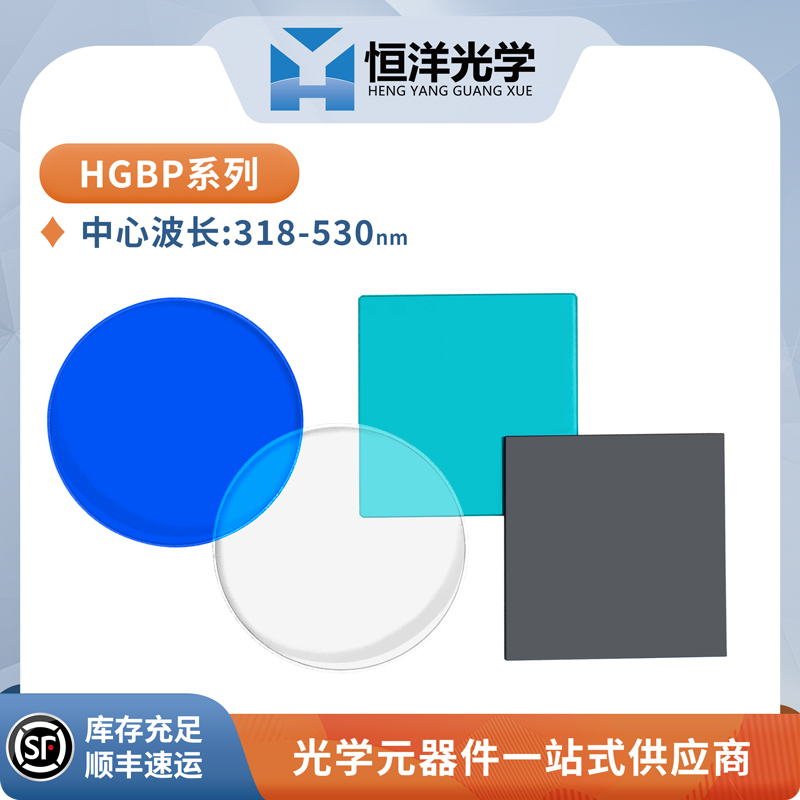 恒洋光学 HGBP系列 颜色玻璃带通滤光片是指在玻璃熔炼过程中添加特种元素,从而对不同的光谱波段产生吸收,并对其他波段光谱透过。因采用材料的固有吸收特性或透射特性,对比于于介质镀膜滤光片,颜色玻璃滤光片对不同入射角入射的光束,其中心波长不会变动。