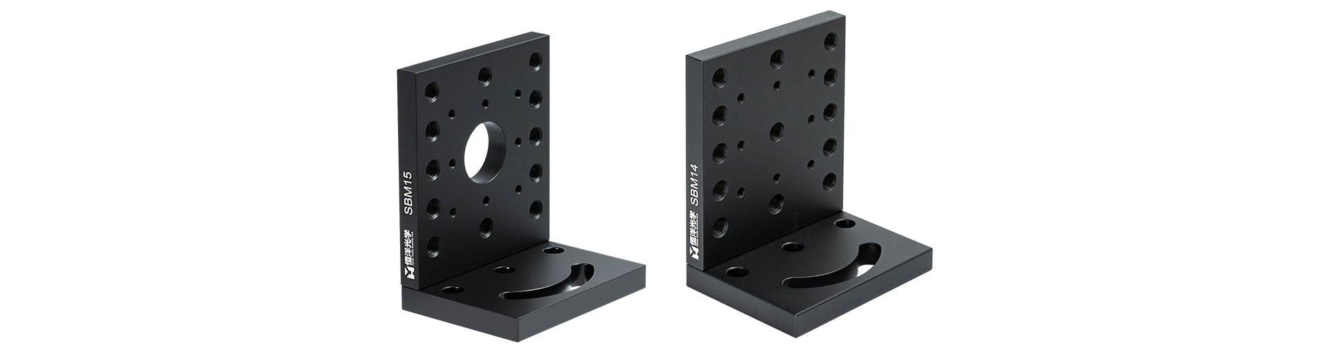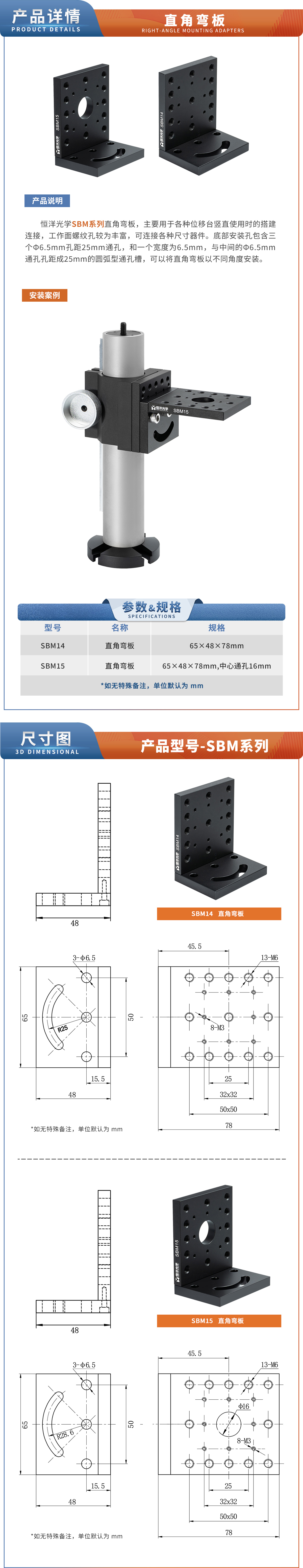 恒洋光学 SBM系列 直角弯板,主要用于各种位移台竖直使用时的搭建连接,工作面螺纹孔较为丰富,可连接各种尺寸器件。底部安装孔包含三个Φ6.5mm孔距25mm通孔,和一个宽度为6.5mm,与中间的Φ6.5mm通孔孔距成25mm的圆弧型通孔槽,可以将直角弯板以不同角度安装。