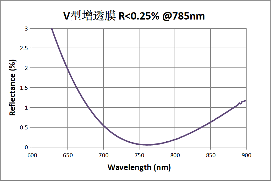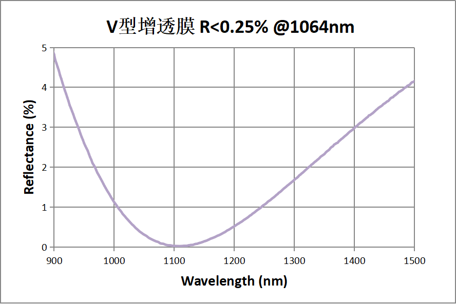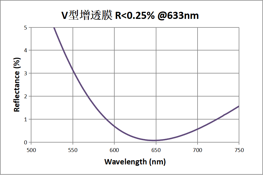 V膜是一种多层的AR介质薄膜,能够最大程度地减少窄波长范围内的反射率。V膜表面反射率在最小值的两侧上升很快,因此反射率曲线呈"V"形。与宽带增透膜相比,当光束处于指定的AOI范围时,V膜在窄带宽范围上的反射率更低。