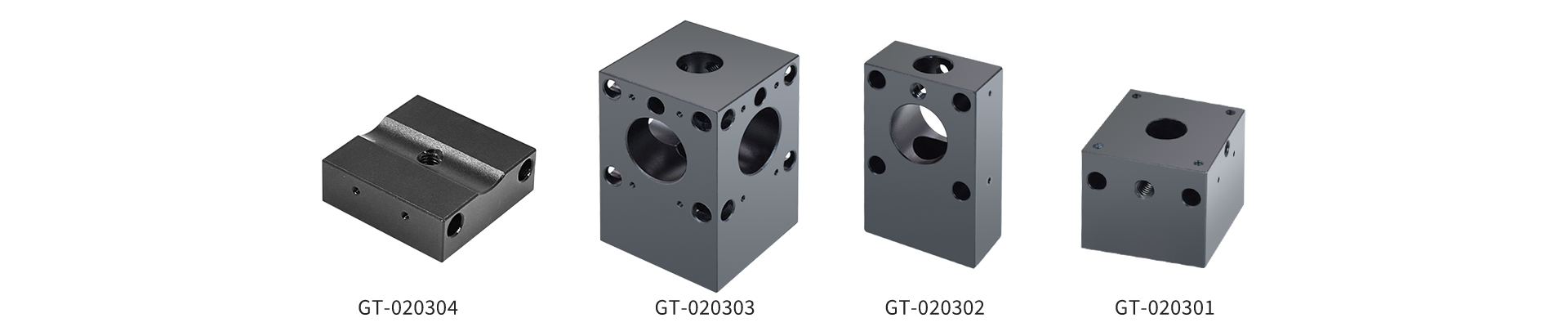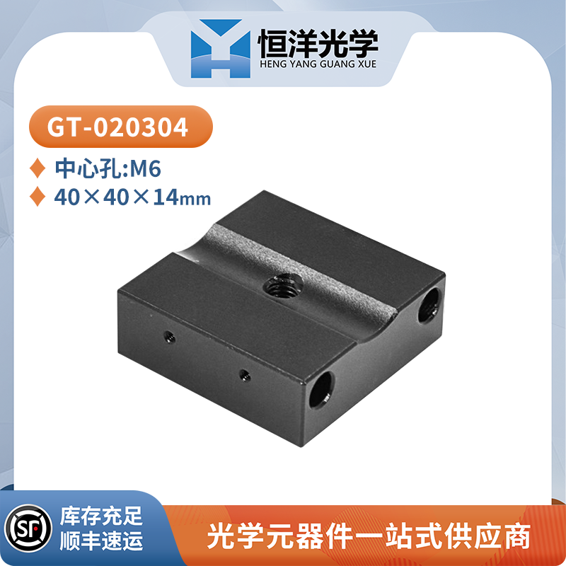 GT-020304笼杆支撑座:本支撑座预留了两个Ø6mm 穿杆孔,上表面留有孔距 32×32mm 的4-M3 的安装螺纹孔,中心有一个 M6 的安装螺纹孔,如此可以将小型平移台或传统调节支座及其固定物安装进同轴光路系统中。