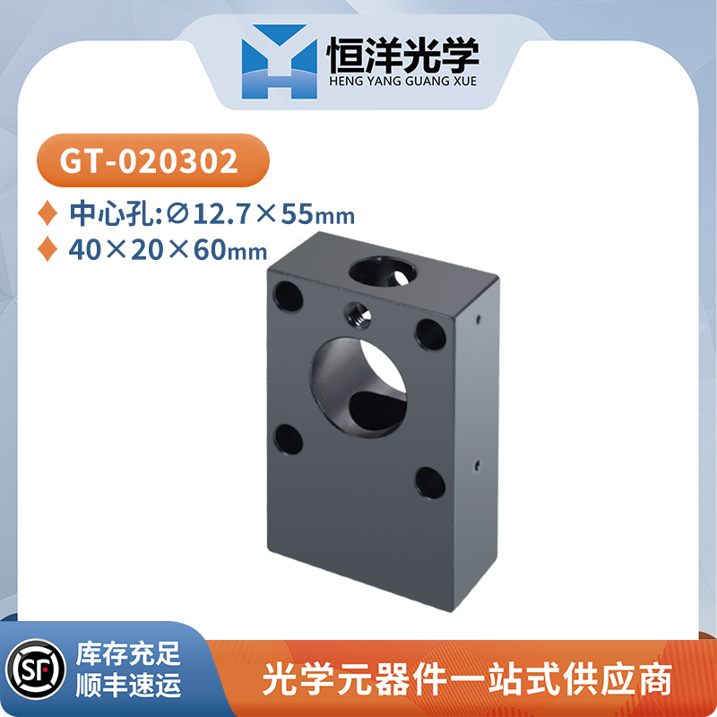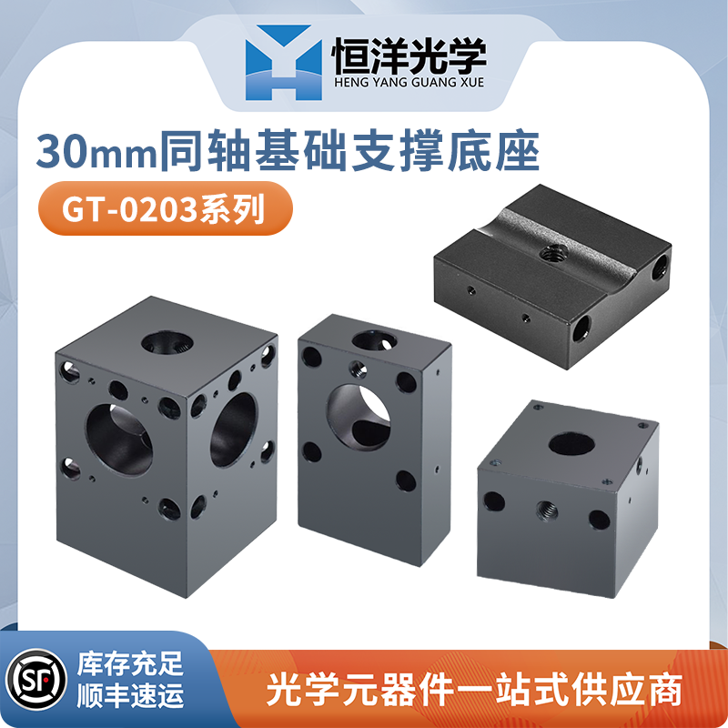 GT-020302兼容支撑座:本支撑座预留了四个 Ø6mm 穿杆孔,上表面的中心处预留了深 55mm 的 Ø12.7mm 的光孔,如此可以将传统支杆及其固定物安装进同轴光路系统中。