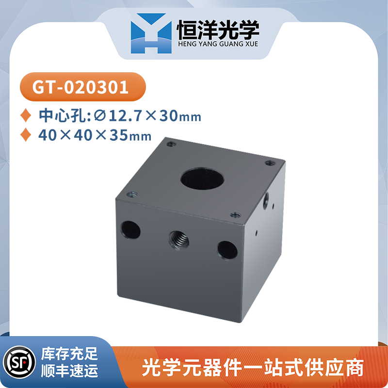 GT-020301转向支撑座:本支撑座预留了两个Ø6mm穿杆孔,上表面留有32×32mm 孔距的4-M3 的安装螺纹孔,上表面的中心处预留了深 30mm 的Ø12.7mm 的光孔,如此可以将小型平移台或传统支杆及其固定物安装进同轴光路系统中。