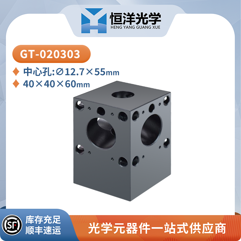 GT-020303垂直支撑座:本支撑座预留了双向八个 Ø6mm 穿杆孔,上表面的中心预留了深55mm 的 Ø12.7mm 的光孔,如此可以将传统支杆及其固定物安装进 X、Y 垂直交会的同轴光路系统中。
