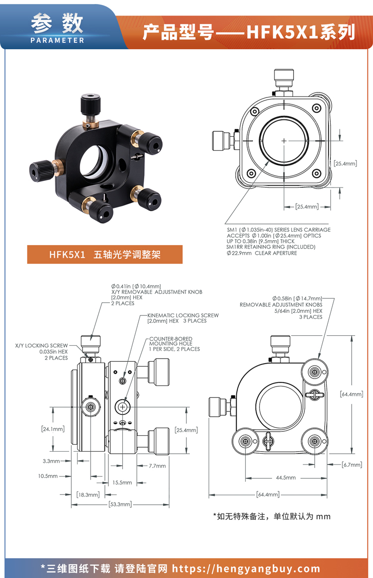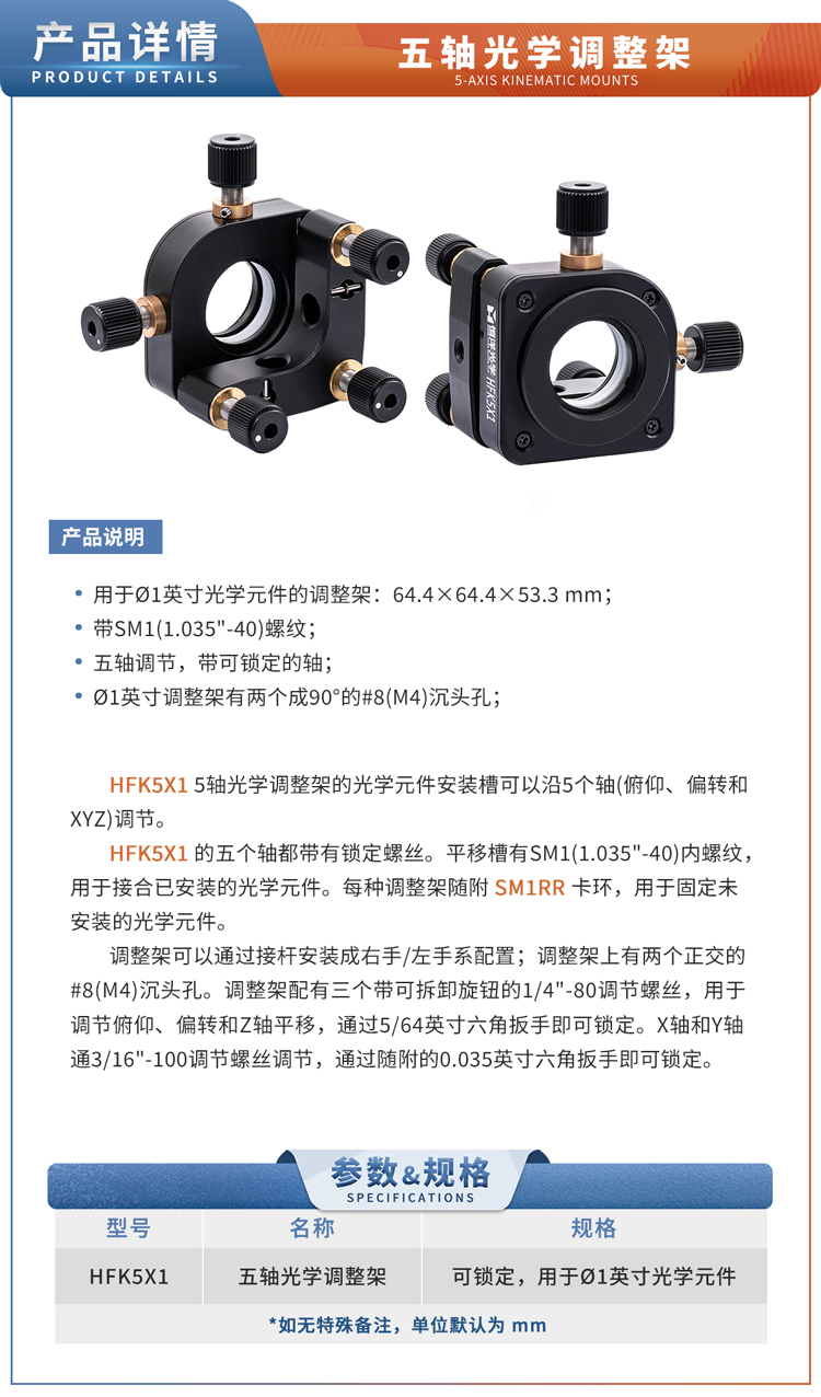 HFK5X1 的五个轴都带有锁定螺丝。平移槽有SM1(1.035"-40)内螺纹,用于接合已安装的光学元件。每种调整架随附 SM1RR 卡环,用于固定未安装的光学元件。
