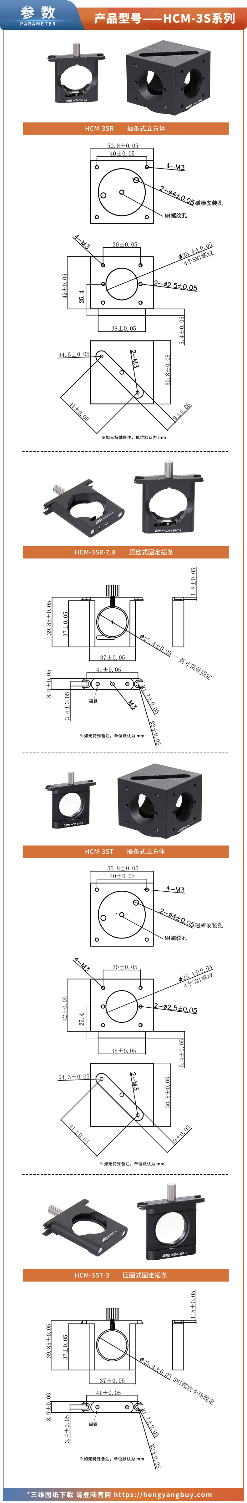 ▶ HCM-3SR 为顶丝式立方体套装,产品包含一个立方体+一个顶丝式插条(HCM-3SR-7.8)。 ▶ HCM-3ST 为压圈式立方体套装,产品包含一个立方体+一个压圈式插条(HCM-3ST-3)。▶ HCM-3SR-7.8 为顶丝式插条,夹持厚度为1mm~7.8mm。 ▶ HCM-3ST-3 为压圈式插条,夹持厚度为1mm~3mm。