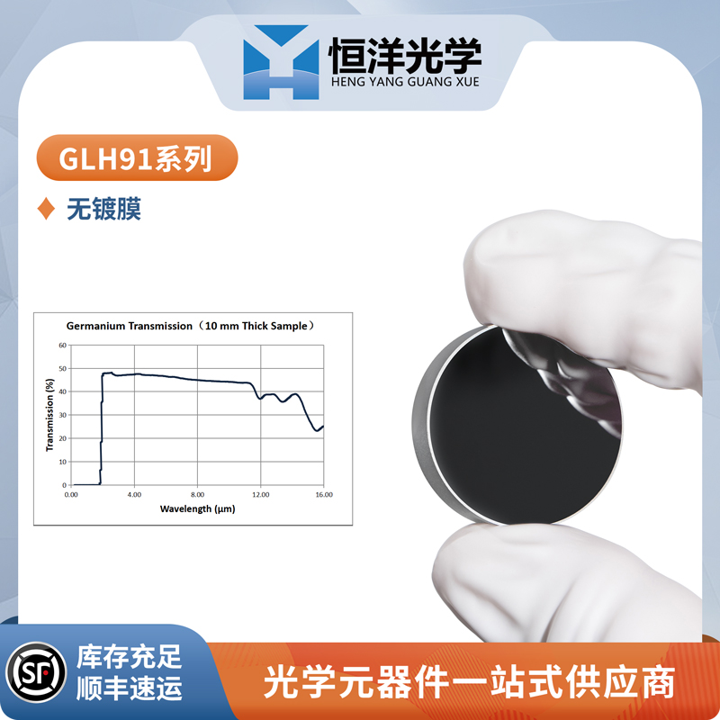 锗是一种红外波段常用的光学玻璃材料,透过波段为2.0-16μm,具有高折射率,高努氏硬度等特点。锗对空气、水、酸、碱等均成惰性,可用于热成像及恶劣环境下的红外成像。其可以作为多种光学元件的基底,例如透镜、窗口片等。
