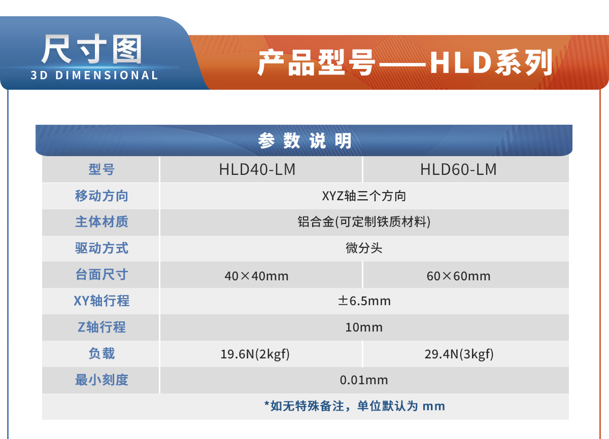 HLD系列 三维组合台是由一个二维平移台+一个升降台组合安装而成;采用交叉滚子导轨,可实现高精度、平滑的位移;主要的材料为铝合金,质量轻。适合内置于其他装置。