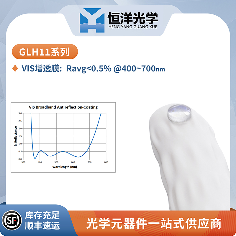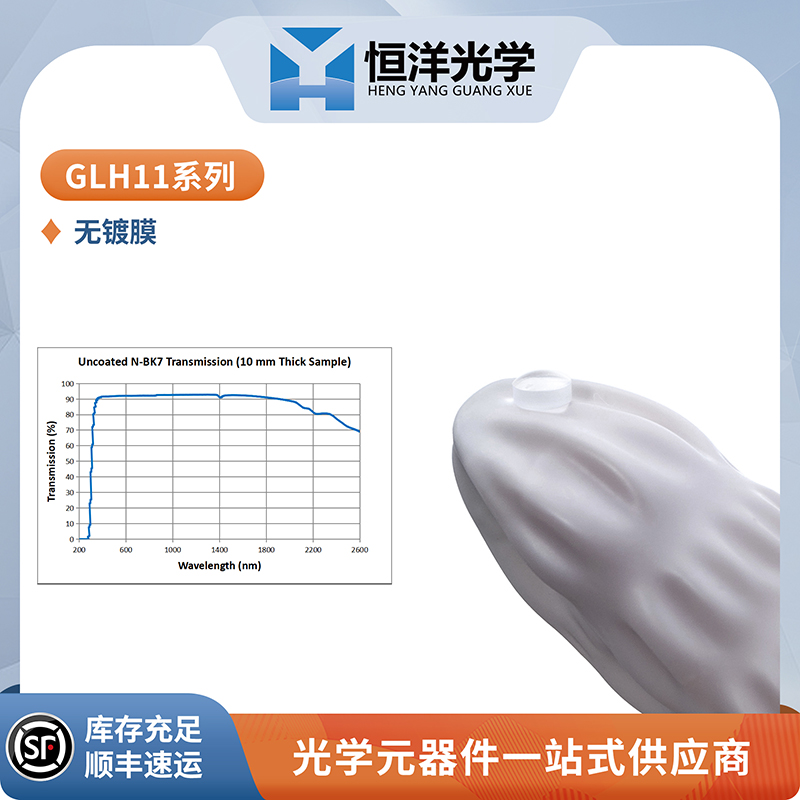 恒洋光学 GLH11系列 平凸透镜采用符合RoHS标准的H-K9L玻璃制成,如果不需要紫外熔融石英的额外优势(即在紫外区域有很好的透过率和较低的热膨胀系数),一般都会选择N-BK7。这些透镜具有正焦距,适合无限远共轭和有限远共轭应用。