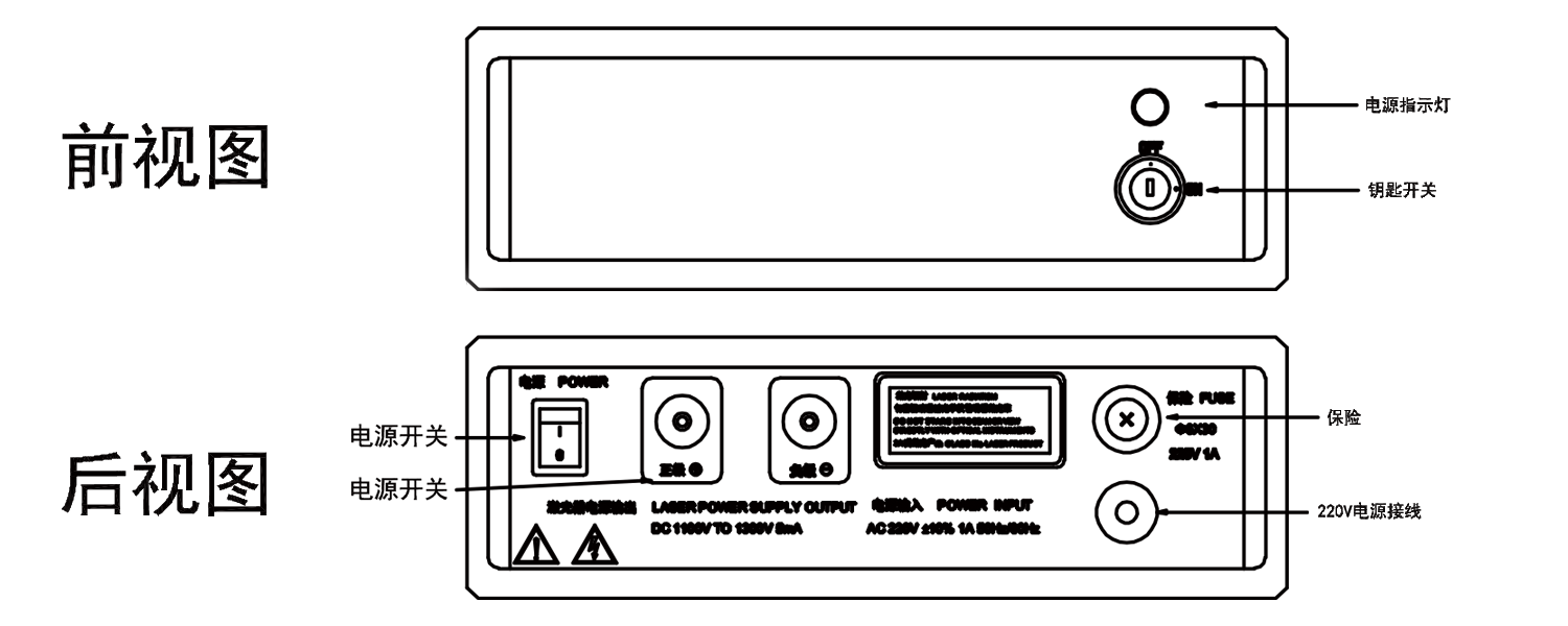 注意事项 1.本产品属警示类产品,务必有专人负责保管电源开启钥匙;激光束不可直视,请切记!2.将激光头与激光电源连接后,才能打开电源开关,切勿让电源空载(即不接入激光头)。否则,电源部件会出现高压击穿现象!3.激光头壳内装的器件为玻璃制品,小心轻放,防止磕碰。4.出厂时该激光头与电源已匹配好,须注意不可随意更换电源。5.激光电源内部含高压输出,除专业人员外请勿拆盒!