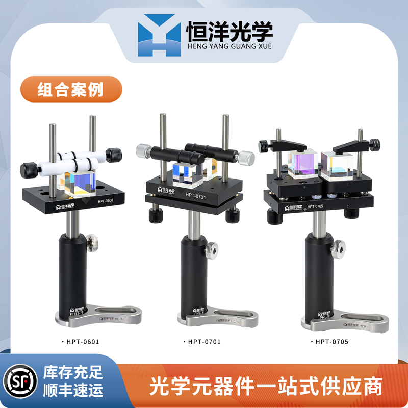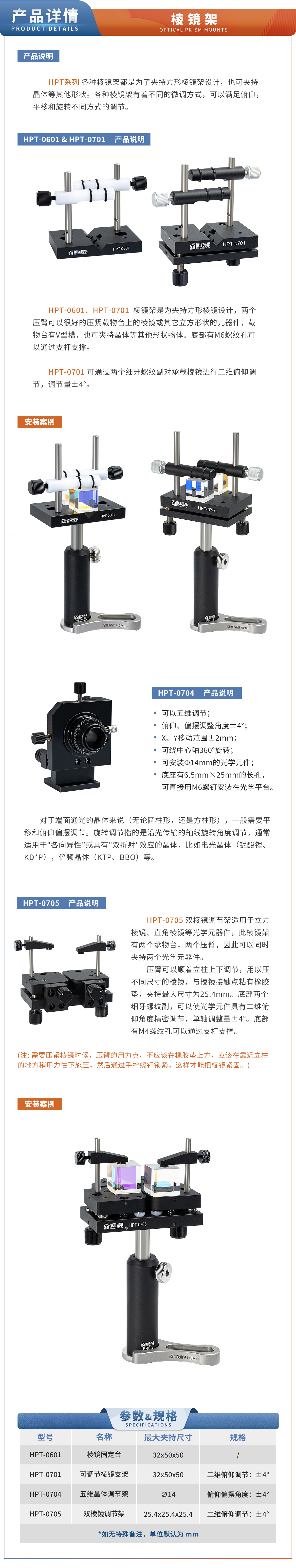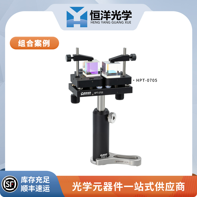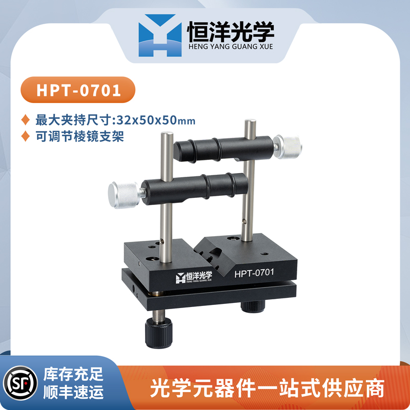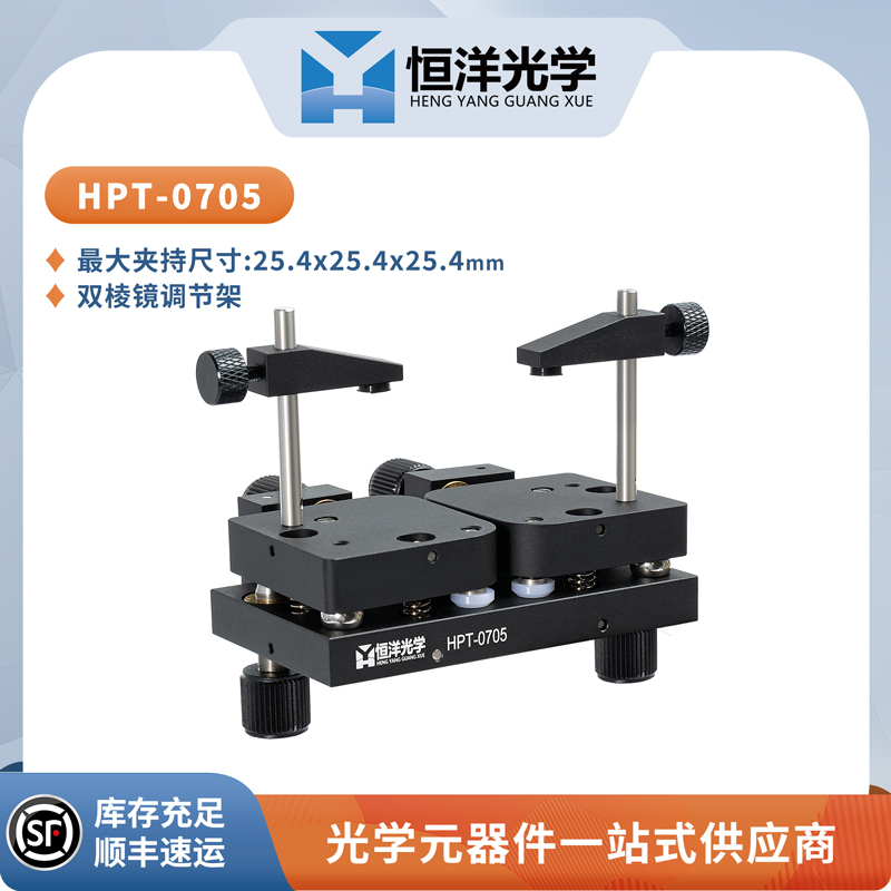 HPT-0705 双棱镜调节架适用于立方棱镜、直角棱镜等光学元器件,此棱镜架有两个承物台,两个压臂,因此可以同时夹持两个光学元器件。