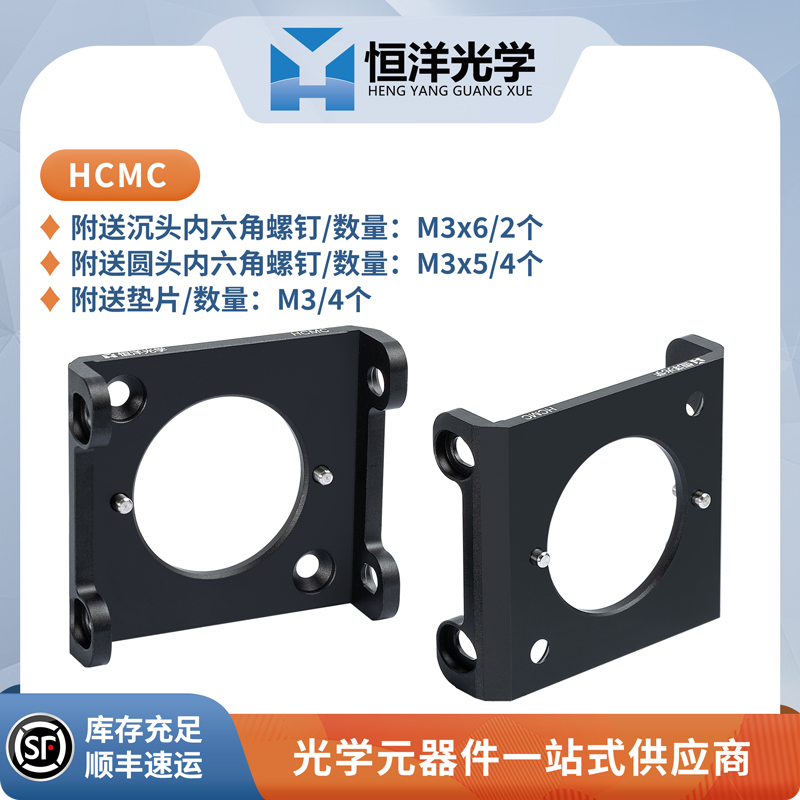 恒洋光学 HCMC 30mm同轴立方体连接件兼容30mm同轴立方体,HCMC 中心为Ø26.4mm贯穿孔,设计用于将两个同轴立方体连接起来。两个Ø2.37mmx6.5mm的定位销钉保证圆孔中心和同轴立方体SM1螺纹孔中心对齐,另购买 HCMC 附送2个沉头内六角螺钉M3x6、4个圆头内六角螺钉M3x5和4个适用于M3螺丝的平垫。