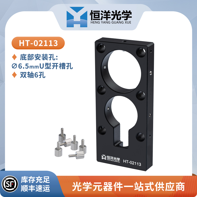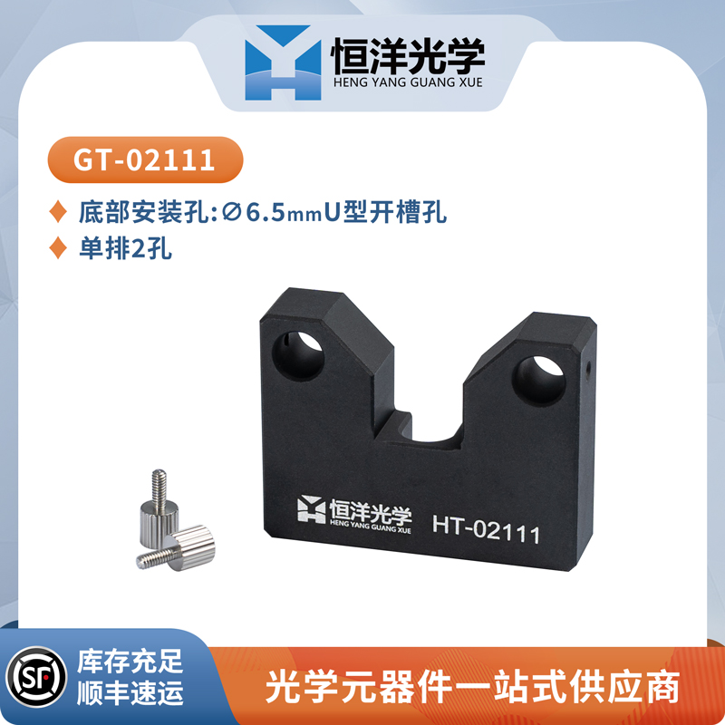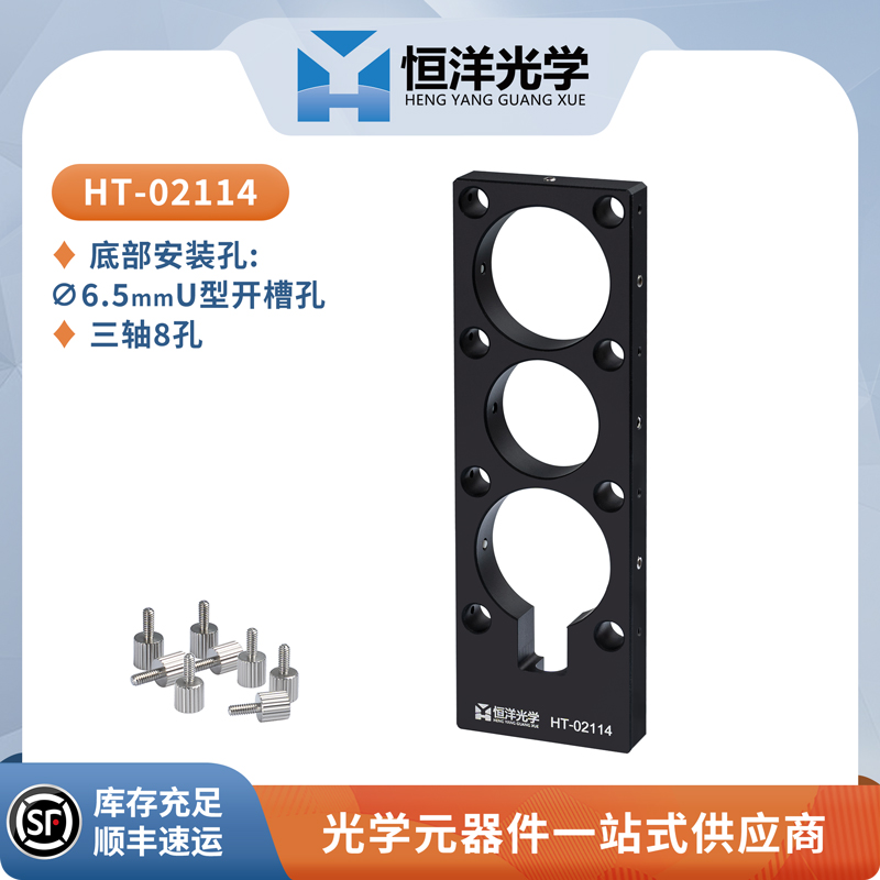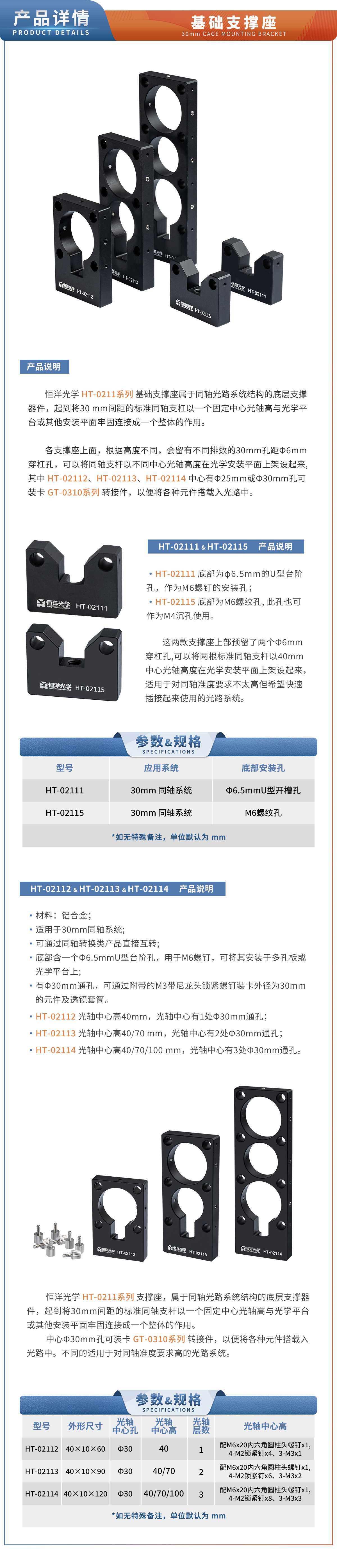 恒洋光学 HT-0211系列 支撑座,属于同轴光路系统结构的底层支撑器件,起到将30mm间距的标准同轴支杆以一个固定中心光轴高与光学平台或其他安装平面牢固连接成一个整体的作用。中心Φ30mm孔可装卡 GT-031系列 转接件,以便将各种元件搭载入光路中。不同的适用于对同轴准度要求高的光路系统。