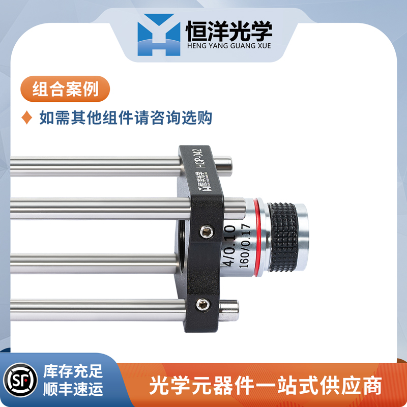 恒洋光学 HCP-042 笼板可将我们的显微物镜等RMS螺纹元件集成到30mm笼式系统。每个笼杆通孔的侧面有一个M4固定螺丝,可以通过5/64英寸(2.0 mm)球头起子或六角扳手固定。HCP-042 也可以通过位于底部的8-32(M4)螺孔安装接杆。